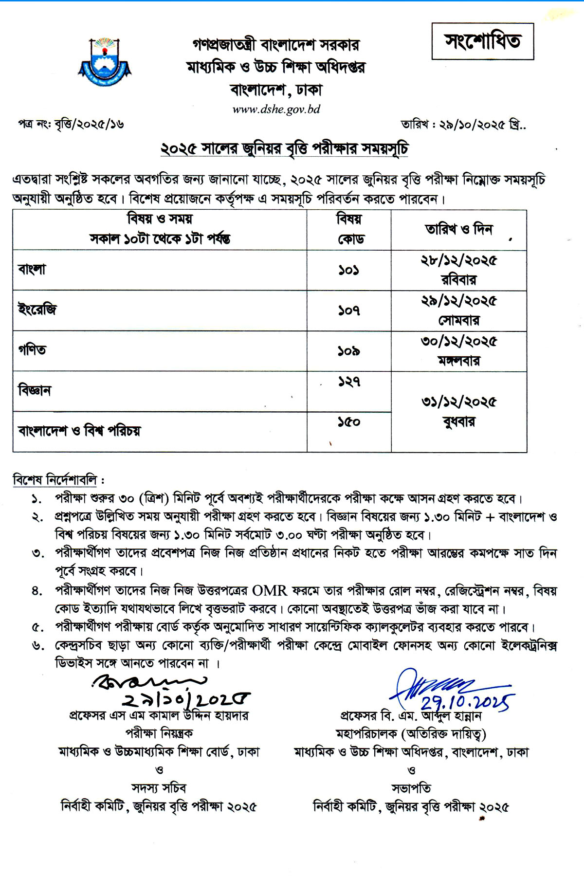২০২৫ সালের জুনিয়র বৃত্তি পরীক্ষার সংশোধিত সময়সূচি