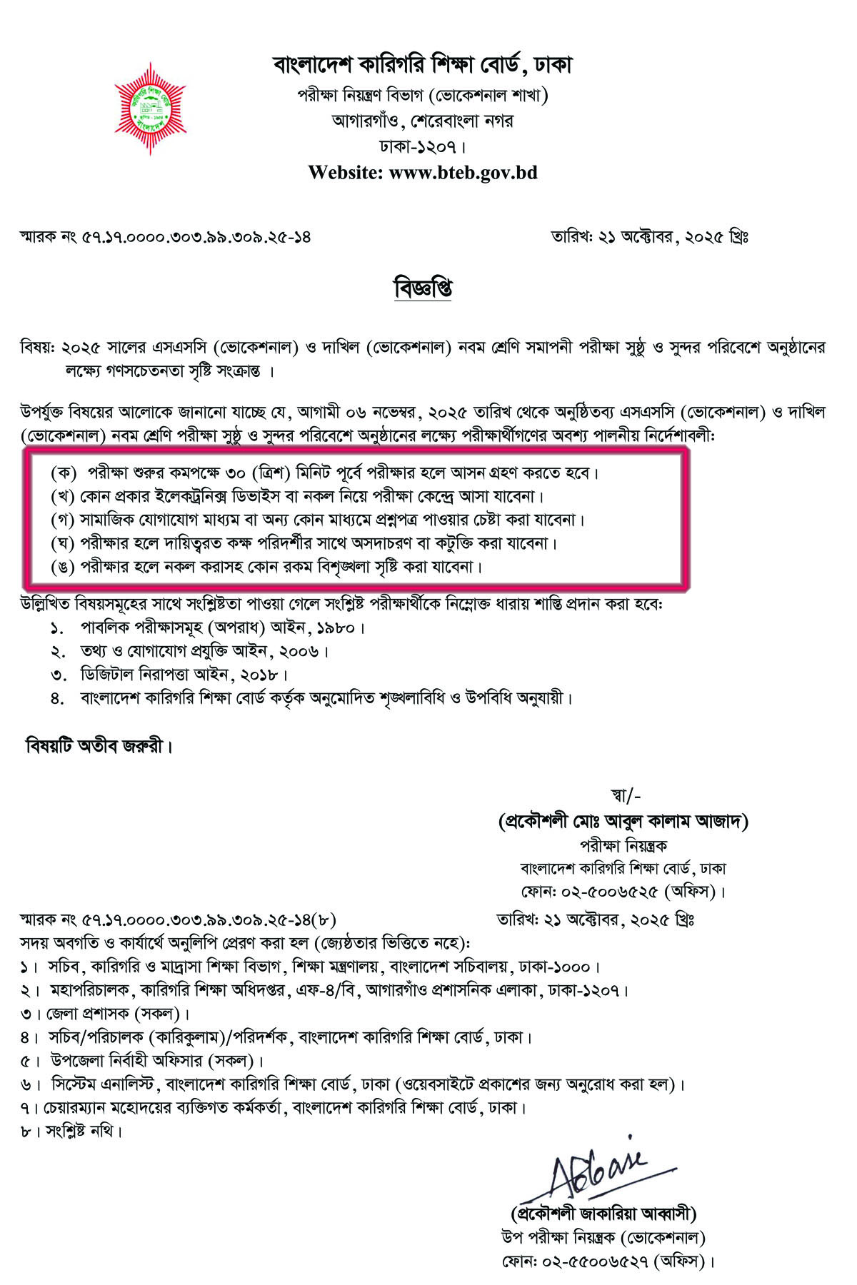 এসএসসি (ভোকেশনাল) ও দাখিল (ভোকেশনাল) নবম শ্রেণি পরীক্ষা ২০২৫ সংক্রান্ত নির্দেশনাবলী