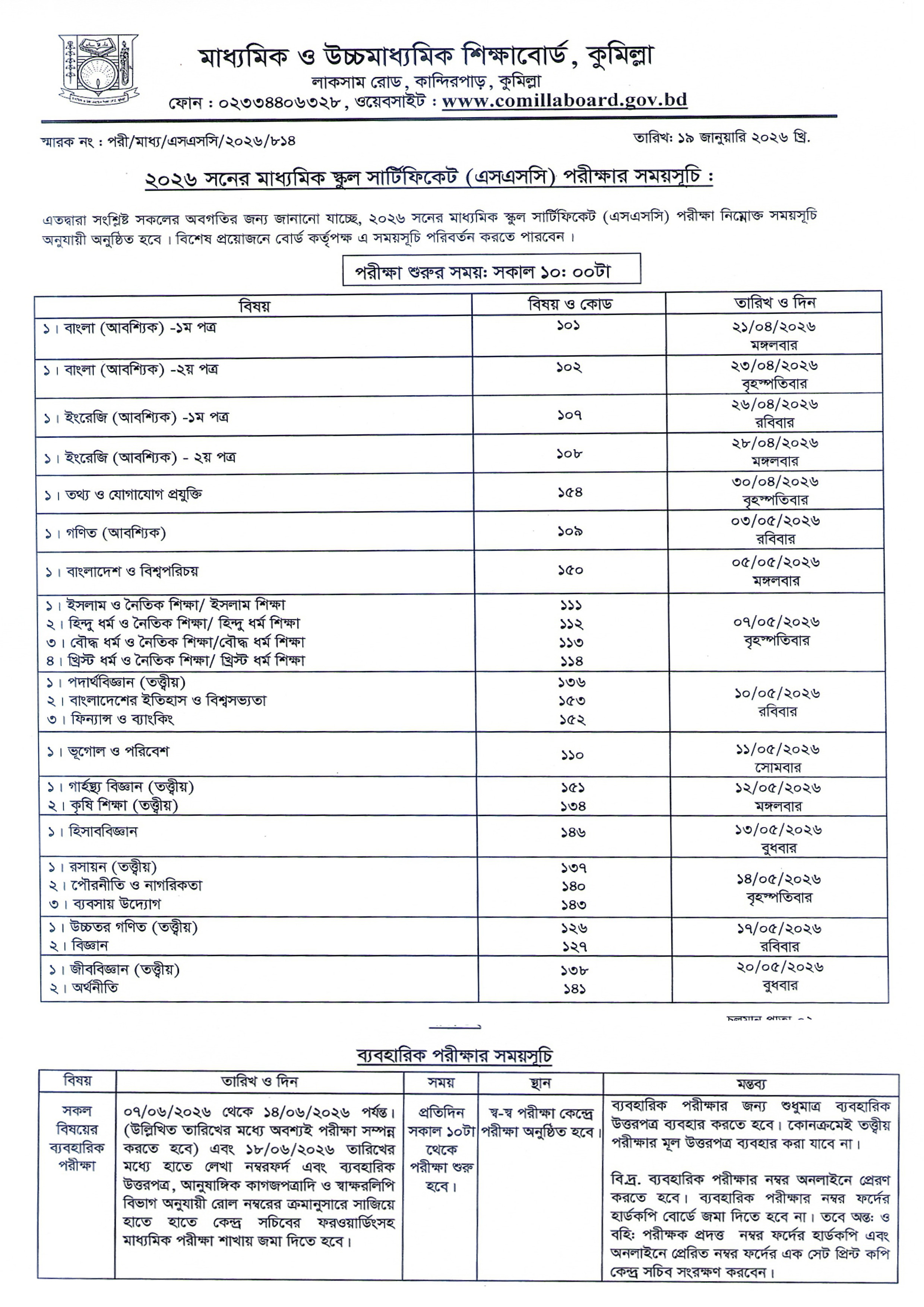 ২০২৬ সনের মাধ্যমিক স্কুল সার্টিফিকেট (এসএসসি) পরীক্ষার সময়সূচি |