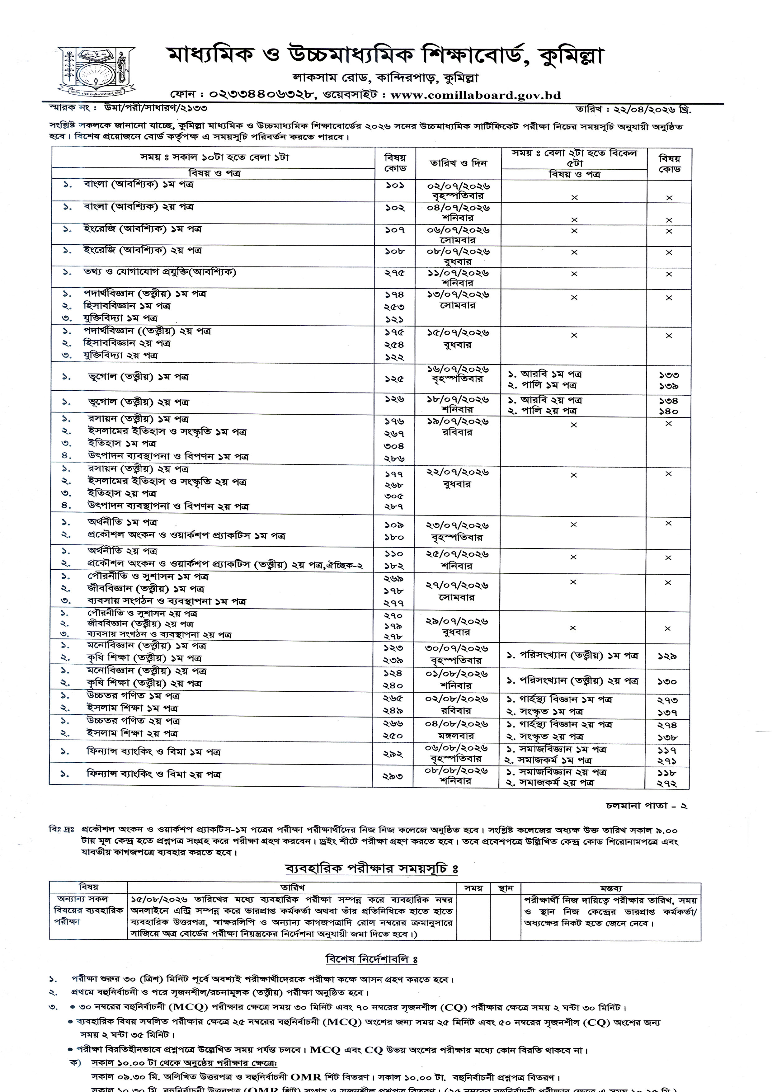 এইচ এস সি পরীক্ষার সময়সূচি ২০২৬